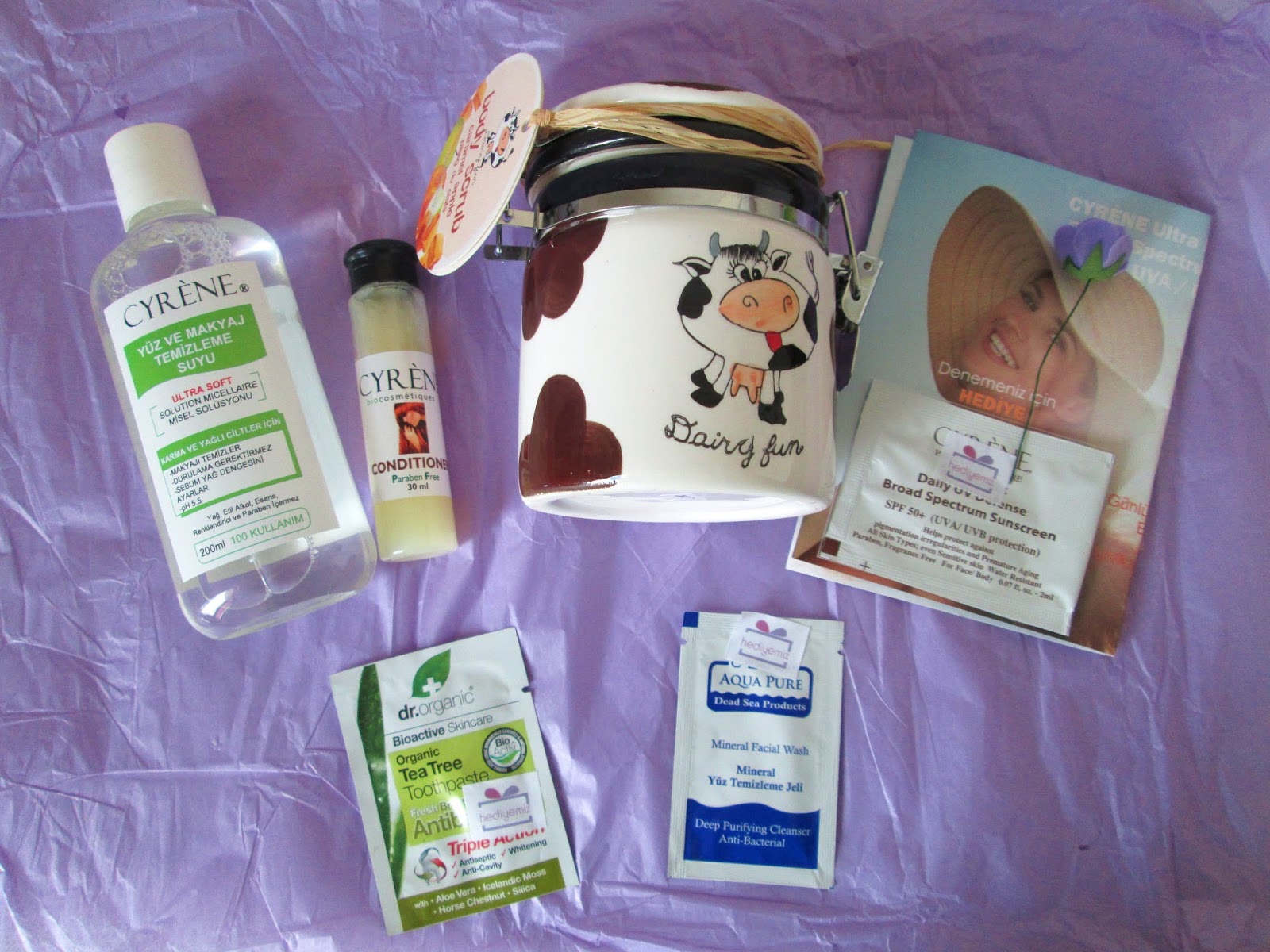 Ben bu alışverişimde sadece Cyrene makyaj temizleme suyu ve Dairy Fun vücut scrubı aldım.Geriye kalanlar ise gönderilen testerlar.Ayrıca lila kutu size tester seçme hakkı veriyor.Cyrene saç kremi testerını ben seçtim diğerlerini kendileri göndermişler.